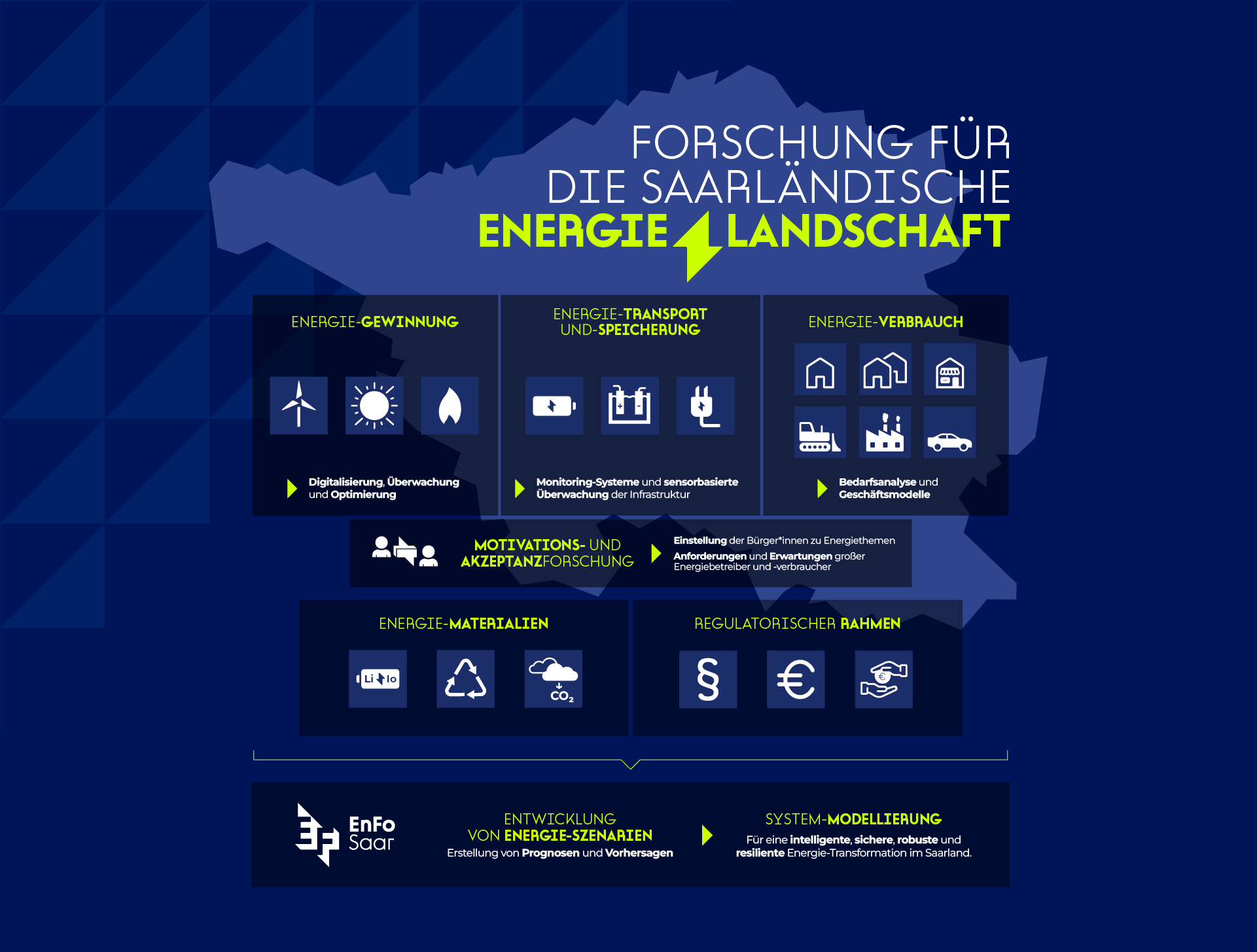 EnFo entwickelt wissenschaftlich fundierte Methoden und Werkzeuge, um die Transformation der saarländischen Energiewirtschaft systematisch und effizient voranzutreiben. Hierbei geht es nicht nur darum neue Erkenntnisse zu gewinnen, sondern auch praktikable Lösungen bereitzustellen, die einen unmittelbaren Einfluss auf die Energiewende in der Region sowie den Energieverbrauch jedes Einzelnen haben.